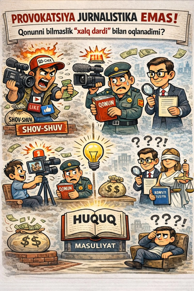P.S. Журналист бўлиш — фақат камера ёқиш эмас. Бу, аввало, қонунни билиш, масъулиятни ҳис қилиш ва сўзнинг жамиятга таъсирини англаш демакдир. Агар ҳар бир баҳс шов-шув билан, ҳар бир савол босим билан, ҳар бир лавҳа эса провокация билан якунланса, бу журналистика эмас — бу томоша бўлиб қолади. Жамият эса томоша эмас, ҳақиқатга муҳтож.